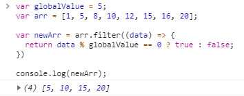 아래 코드는 배열요소에서 5의 배수인 요소만 반환 코드를 화살표 함수를 사용하였다. this를 설정할 수 없어서 숫자 5는 변수로 설정.